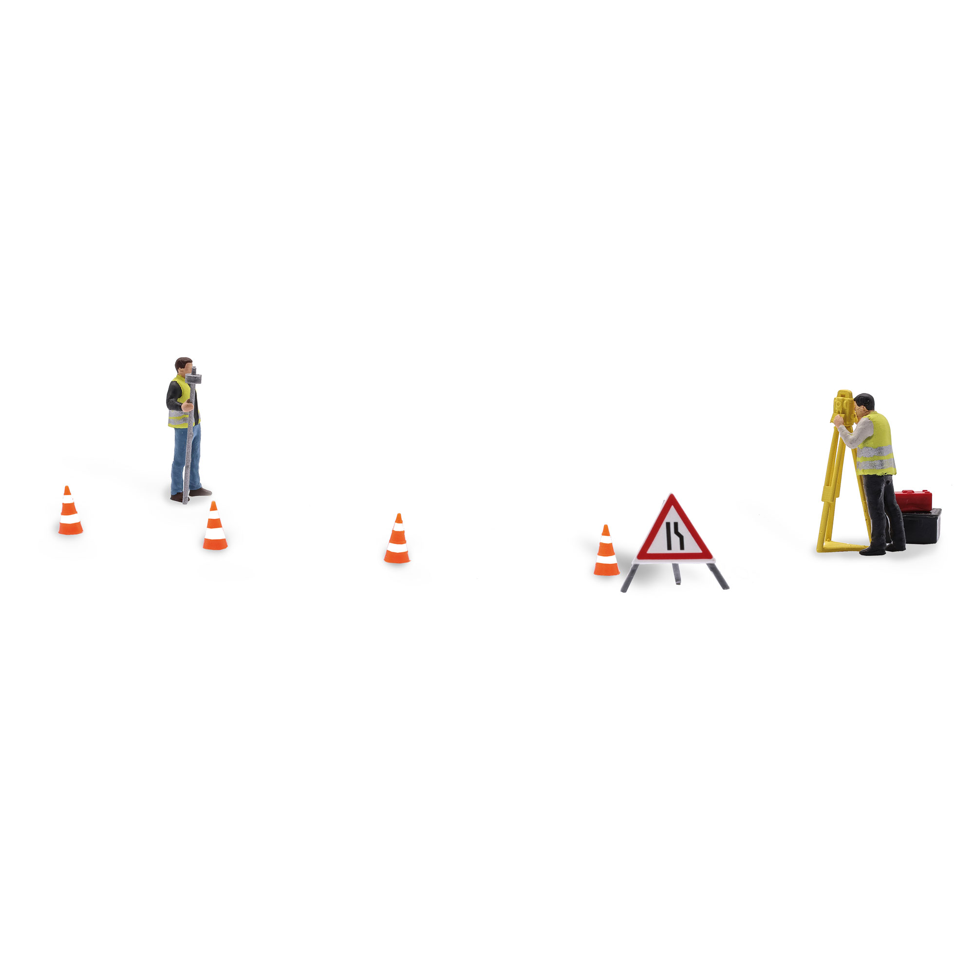 Leitkegel, Verkehrsschild »Verengte Fahrbahn« sowie Materialkisten sichern und ergänzen das Action Set. Geeignet für Epochen 5 und 6.