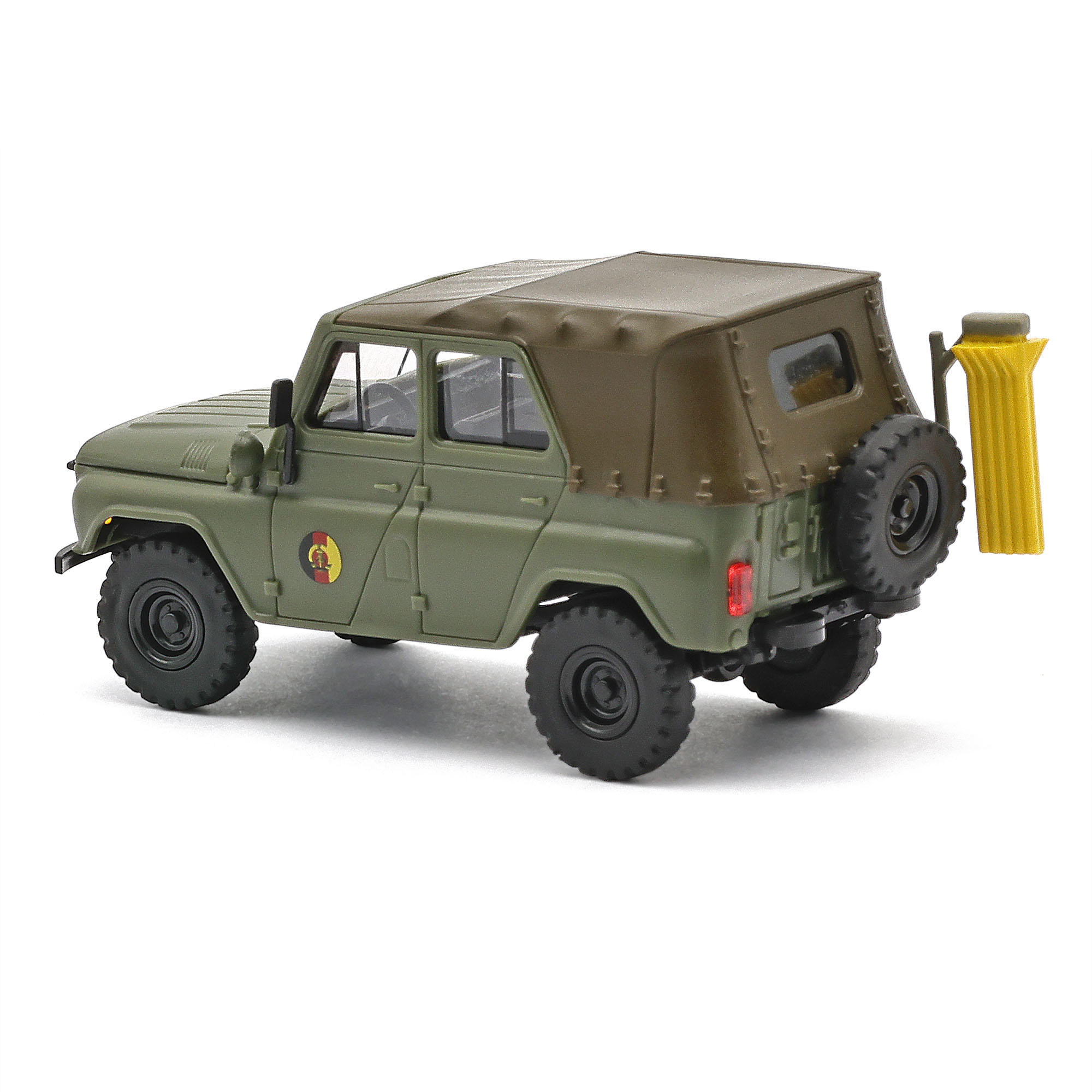 Mattoliv lackierter UAZ des RWD (Raketen und Waffentechnischer Dienst) der NVA in der DDR. Die Aufgaben des RWD umfassen die Sicherstellung der Landstreitkräfte mit Bewaffnung,