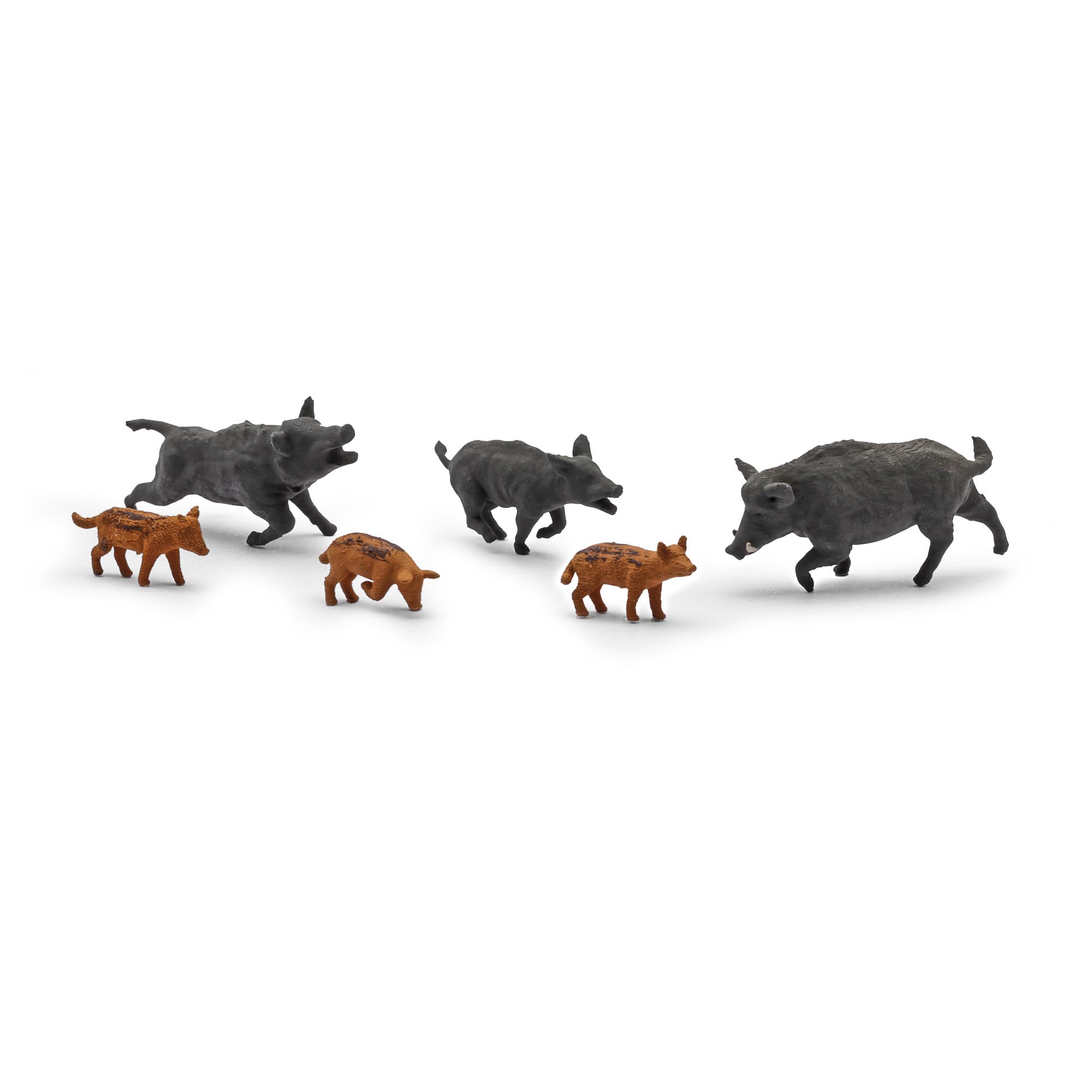 Die sogenannte Rotte besteht in diesem Set aus 2 weiblichen Tieren (Bachen), 3 Frischlingen und einem Keiler. Jedes Tier ist in unterschiedlicher Bewegungsform dargestellt und bereits koloriert. Fertigmodelle.