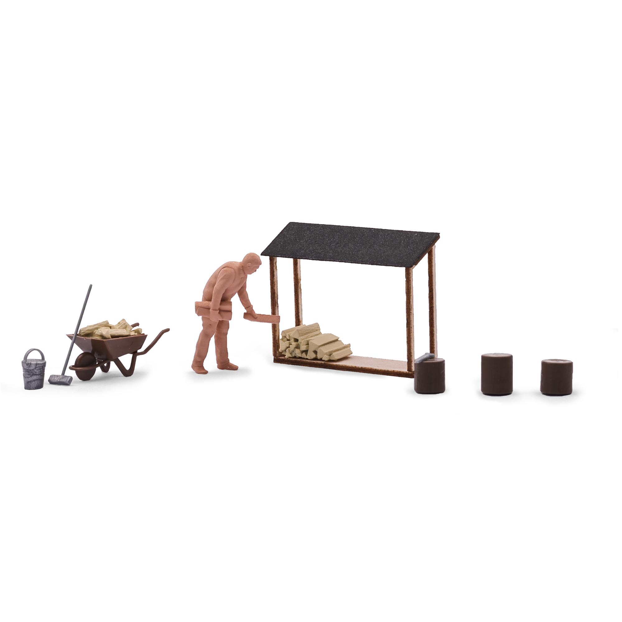 Der Bausatz enthält außerdem eine Figur (zum Selbstbemalen) beim Holzaufschichten, 3 Baumstümpfe, Schubkarren und Werkzeug.