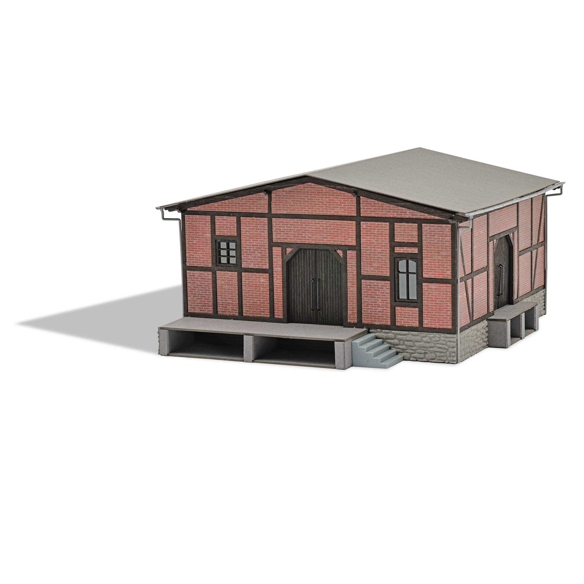 Bausatz für einen historischen Güterschuppen in standardisierter Fachwerk- und Ziegelbauweise. Auch als Lagerschuppen universell einsetzbar.