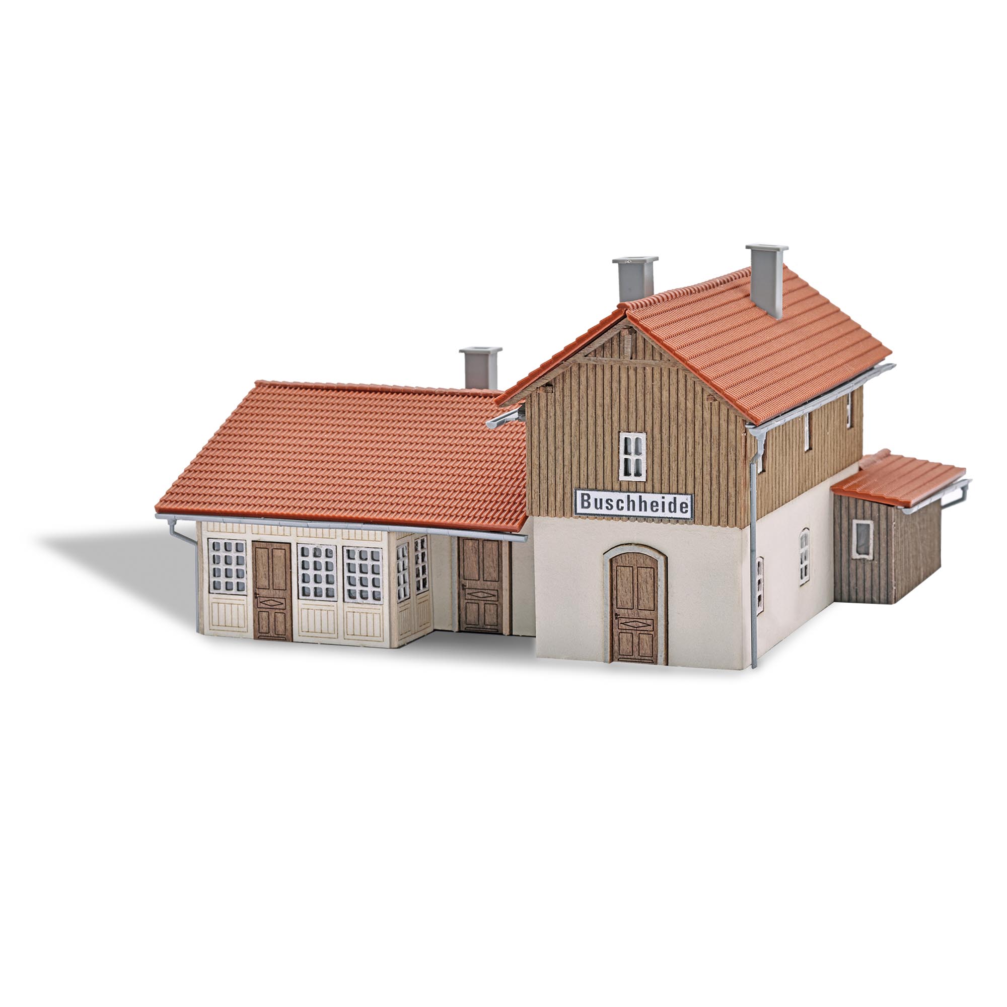 Das Empfangsgebäude hat eine interessante Aufteilung durch den quer zum Bahnsteig stehenden höheren Gebäudeteil, in dem sich auch die Dienstwohnung befindet, sowie dem längs zum Bahnsteig angeordneten niedrigeren Gebäudeteil mit dem angebauten Warteraum. Die Struktur der verputzten Wände ist realistisch dargestellt. Der Dachgiebel besteht aus echtem Holz.