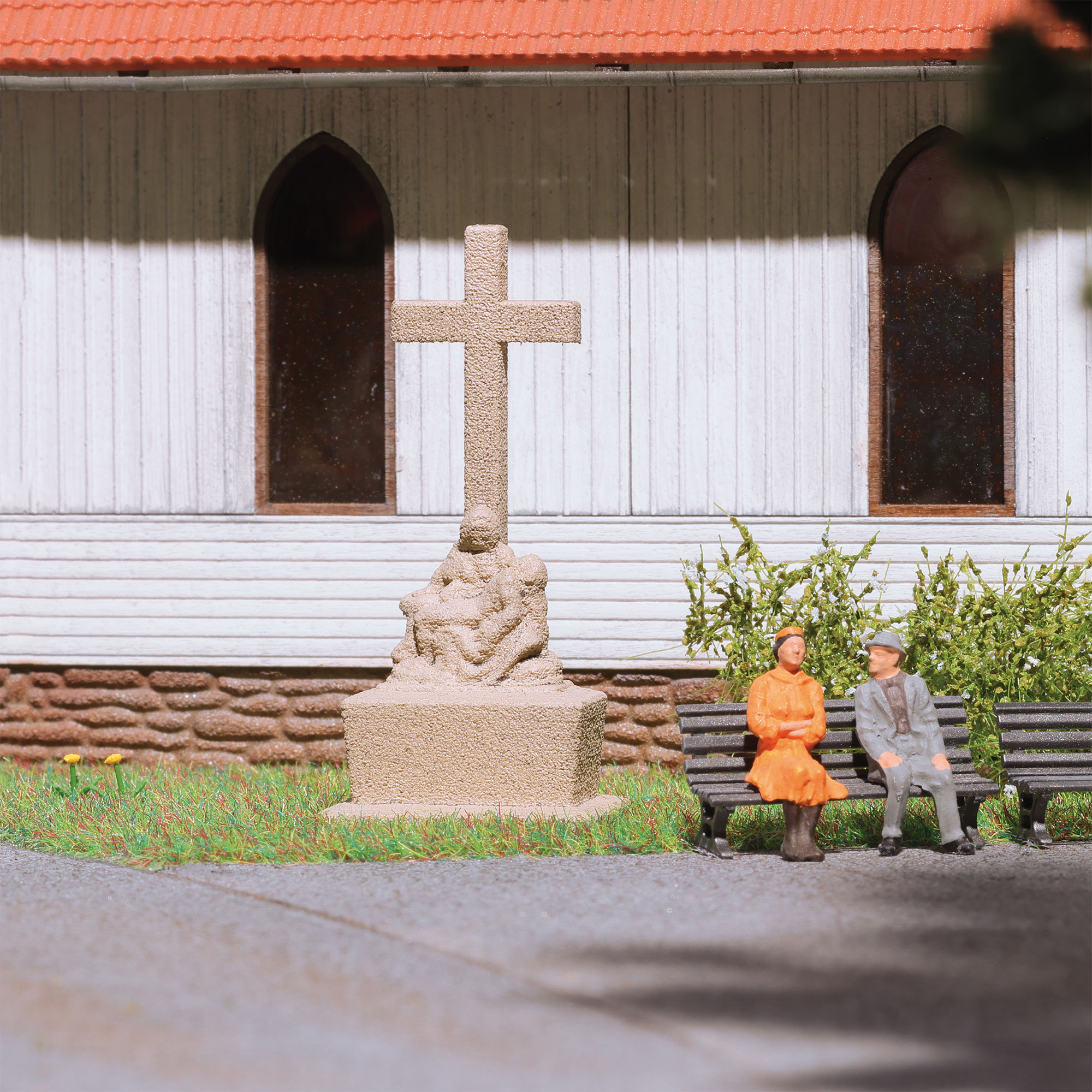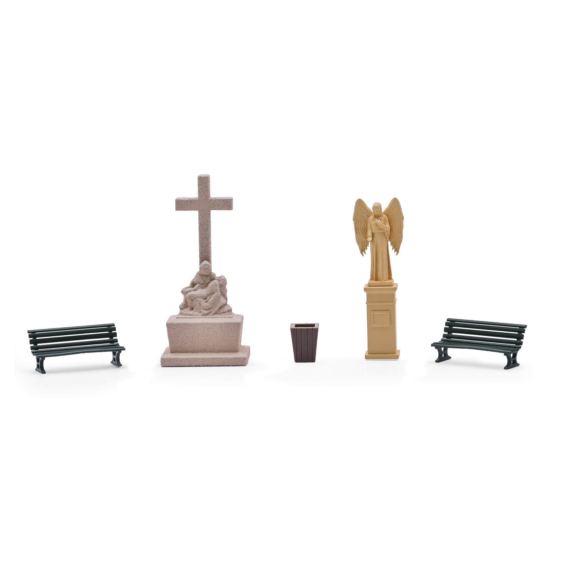 Ce kit comprend une grande croix en pierre avec une figurine, une statue d'ange sur un piédestal, deux bancs et une poubelle. Convient également pour parcs, jardins de châteaux, etc.